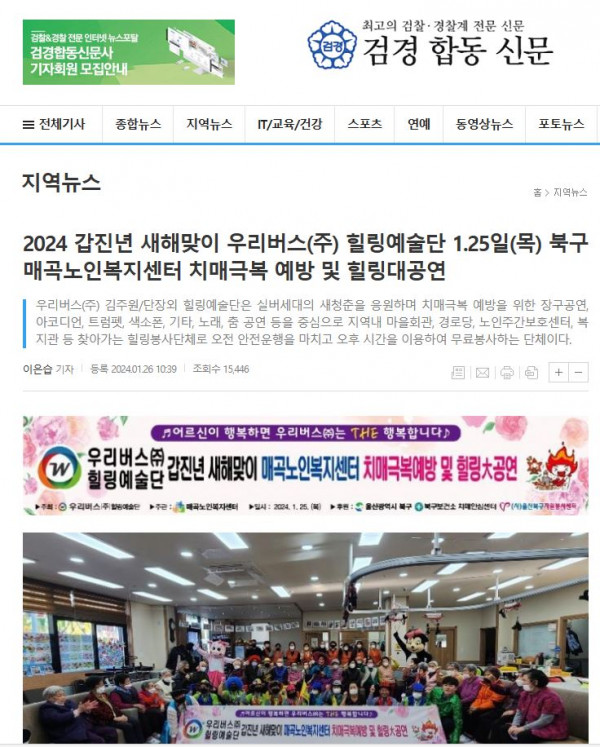 울산지역 마을버스인 우리버스(주) 임직원의 봉사모임인 힐링예술단의 2024년 갑진년 새해 첫 공연을 우리 매곡노인복지센터에서 stdrt 하였습니다.